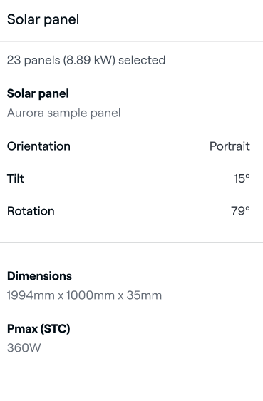 Puede hacer clic y ver los detalles del diseño de alta fidelidad, incluidos los detalles del emplazamiento y los componentes, los resultados de la simulación de rendimiento y el acceso a descargas útiles como el informe de sombras y la lista de materiales.