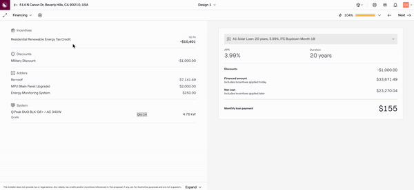 - Costo neto del sistema — Calcula el porcentaje basado en el costo total del sistema: PV + Almacenamiento + Optimizadores de Energía. Úselo para descuentos de todo el sistema que incluyan todos los componentes de electrificación. Si no hay Optimizadores de Energía incluidos en el diseño, el costo neto del sistema se calcula solo sobre PV + Almacenamiento.