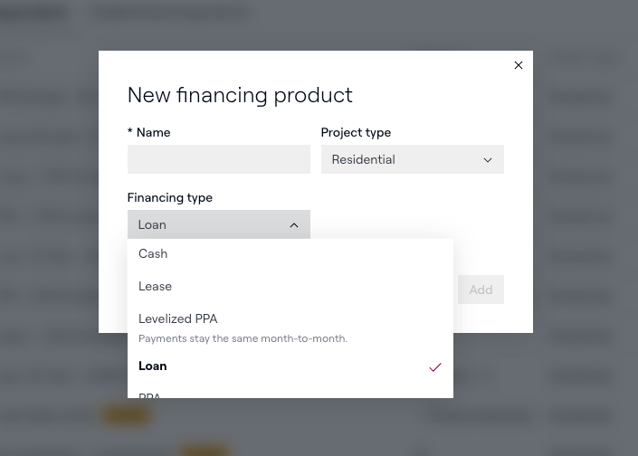 Los productos de financiamiento son plantillas que los administradores de cuenta crean para modelar las opciones financieras que su equipo presenta a los propietarios de viviendas: préstamos, arrendamientos, acuerdos de compra de energía (PPA) y efectivo. Una vez configurados, los productos de financiamiento aparecen en el Modo de Ventas para que los representantes puedan presentar estructuras de pago precisas sin ingresar manualmente las tasas cada vez.