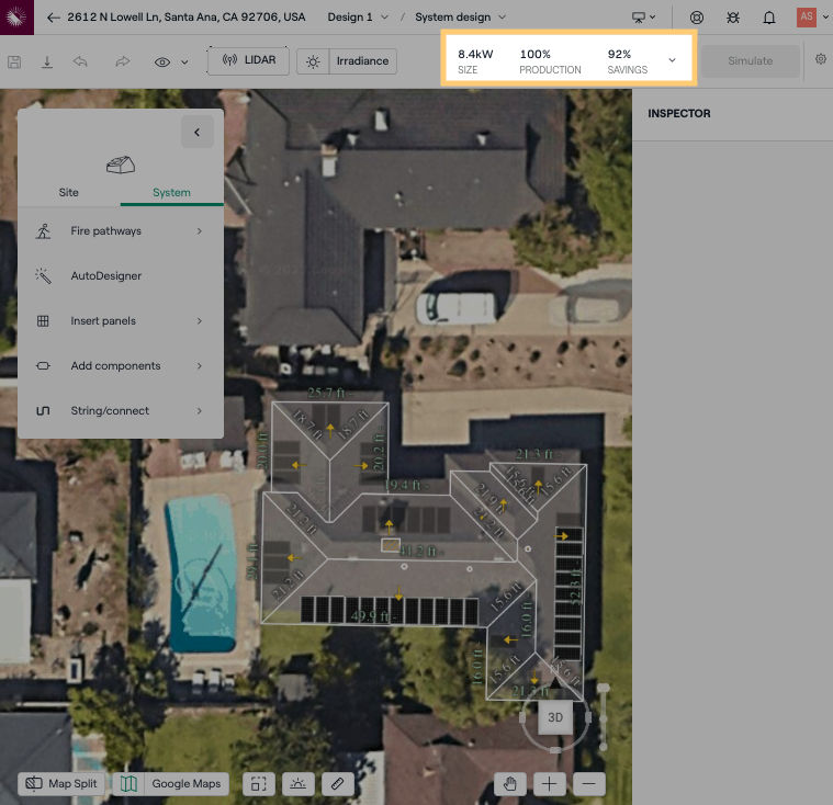 Usa el botón de irradiancia para verificar los valores de irradiancia en tus paneles. Si tus paneles están colocados en un área sombreada, o están demasiado juntos, entonces la producción y los ahorros se verán negativamente afectados.
