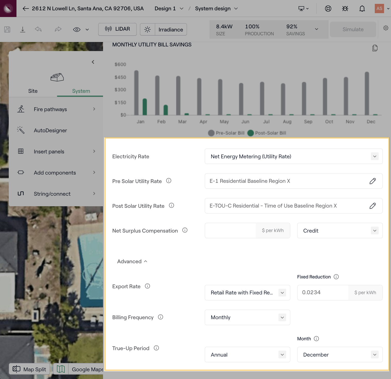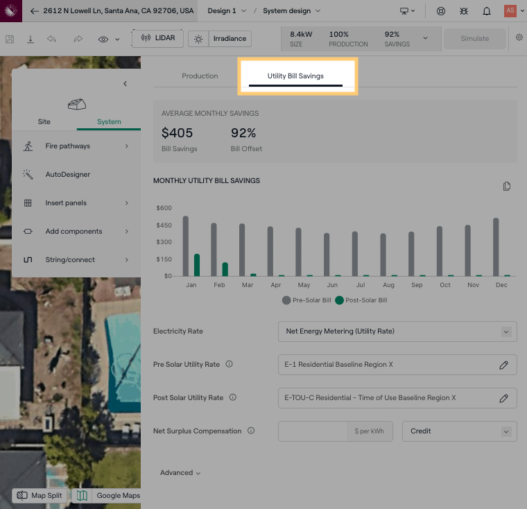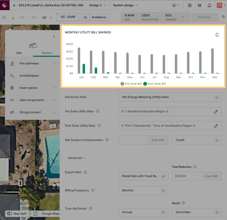 En el Modo de Diseño, haz clic en el área en la parte superior derecha que muestra el Tamaño, Producción y Ahorros de tu diseño. Luego haz clic en Ahorros en la Factura de Servicios Públicos. Aquí puedes ajustar configuraciones como Tasa de Exportación y Período de Ajuste que pueden tener un impacto significativo en tus ahorros proyectados