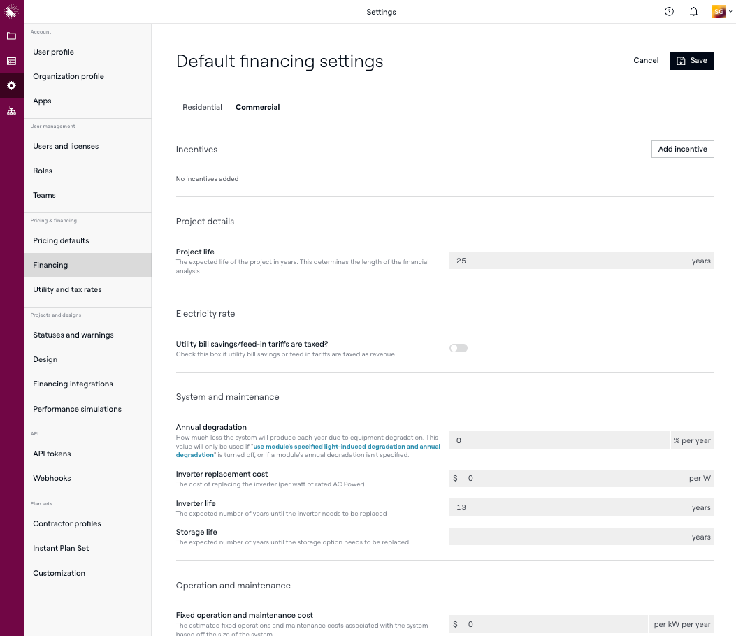 - Configuraciones predeterminadas de financiamiento — establecer las suposiciones del modelo financiero (vida del proyecto, degradación, costos de O&M, tasa de descuento y más) que impulsan los resultados del análisis financiero como VPN, LCOE y período de recuperación.