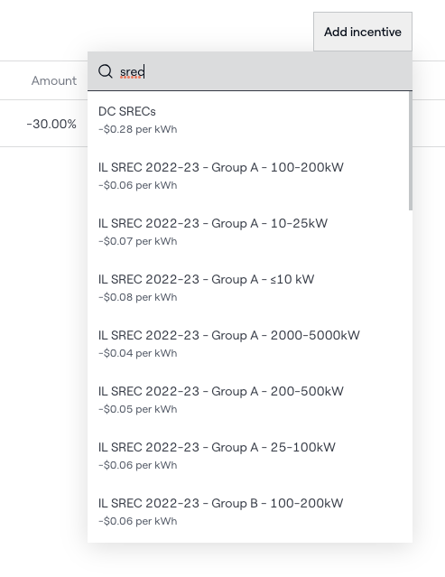 - Cliquez sur Ajouter une incitation et recherchez le programme SREC pertinent.