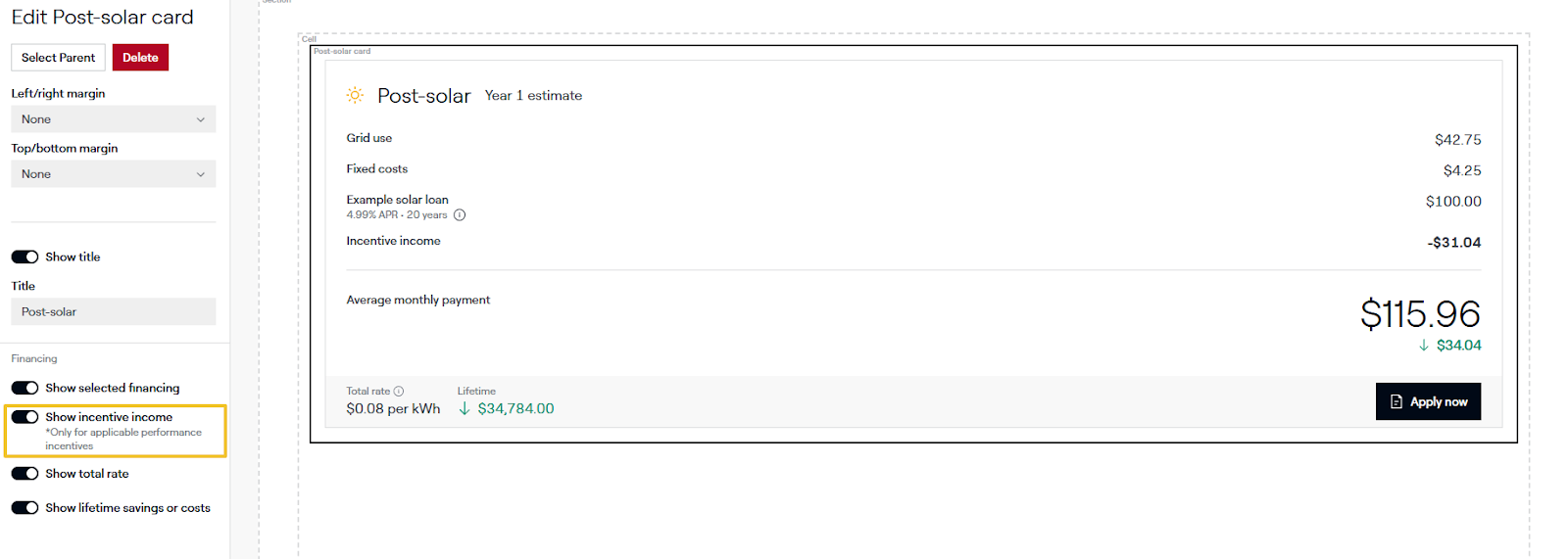 Une fois activé, une ligne Revenus d'incitation apparaîtra dans la carte post-solaire en mode Vente, intégrant les revenus mensuels attendus des SRECs dans la comparaison des factures et le graphique des économies. Remarque : cela ne modifie que la façon dont la valeur est visualisée — cela n'affecte pas les calculs globaux des économies.