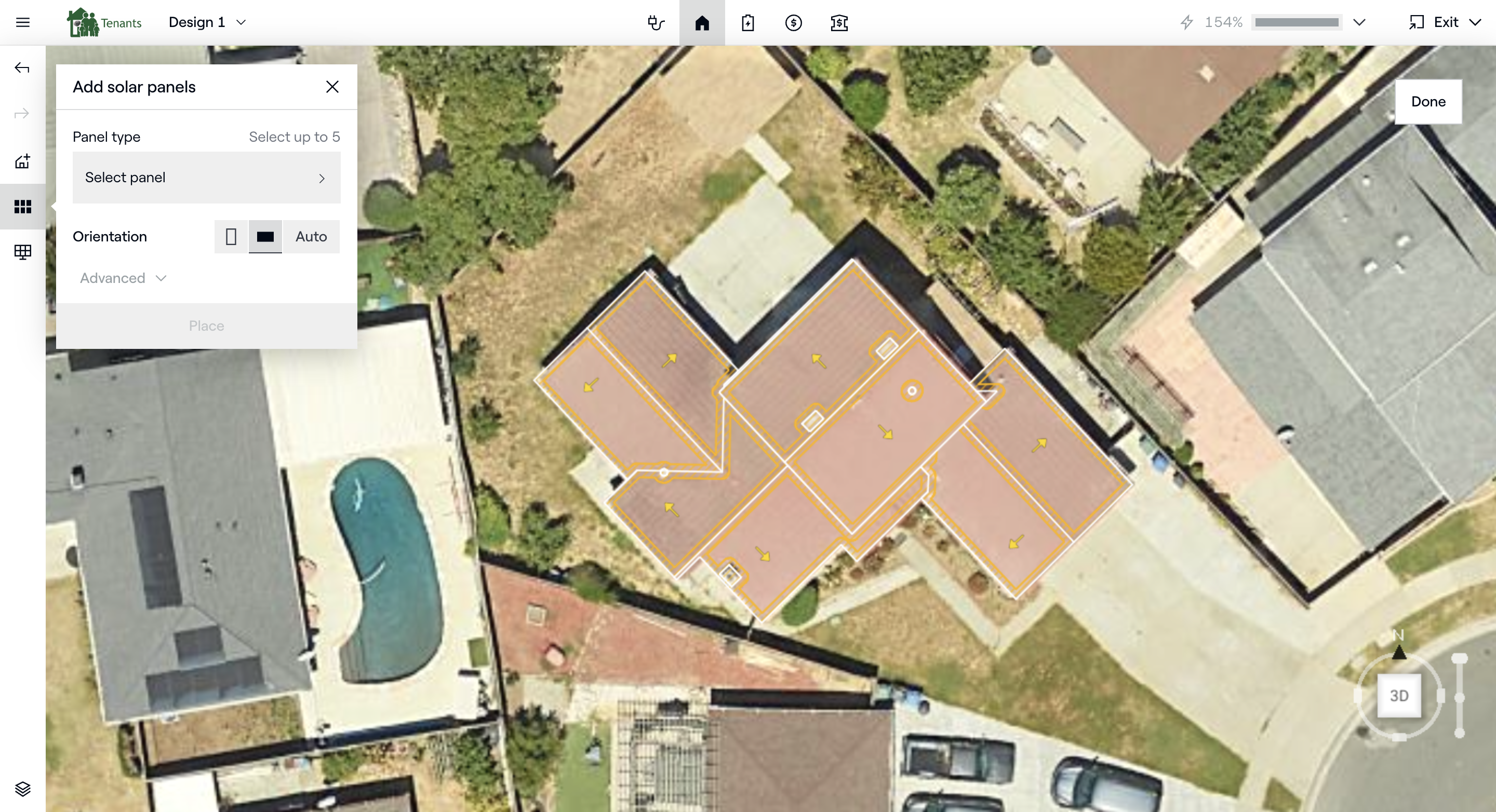 Remarque: Les estimations ne sont disponibles que lorsque tous les panneaux sont placés en mode vente sur le toit. Lorsque vous utilisez des supports au sol ou qu'une partie du système est placée ou modifiée en mode conception, les estimations ne sont pas mises à jour en temps réel et les utilisateurs doivent recalculer pour effectuer la simulation complète.