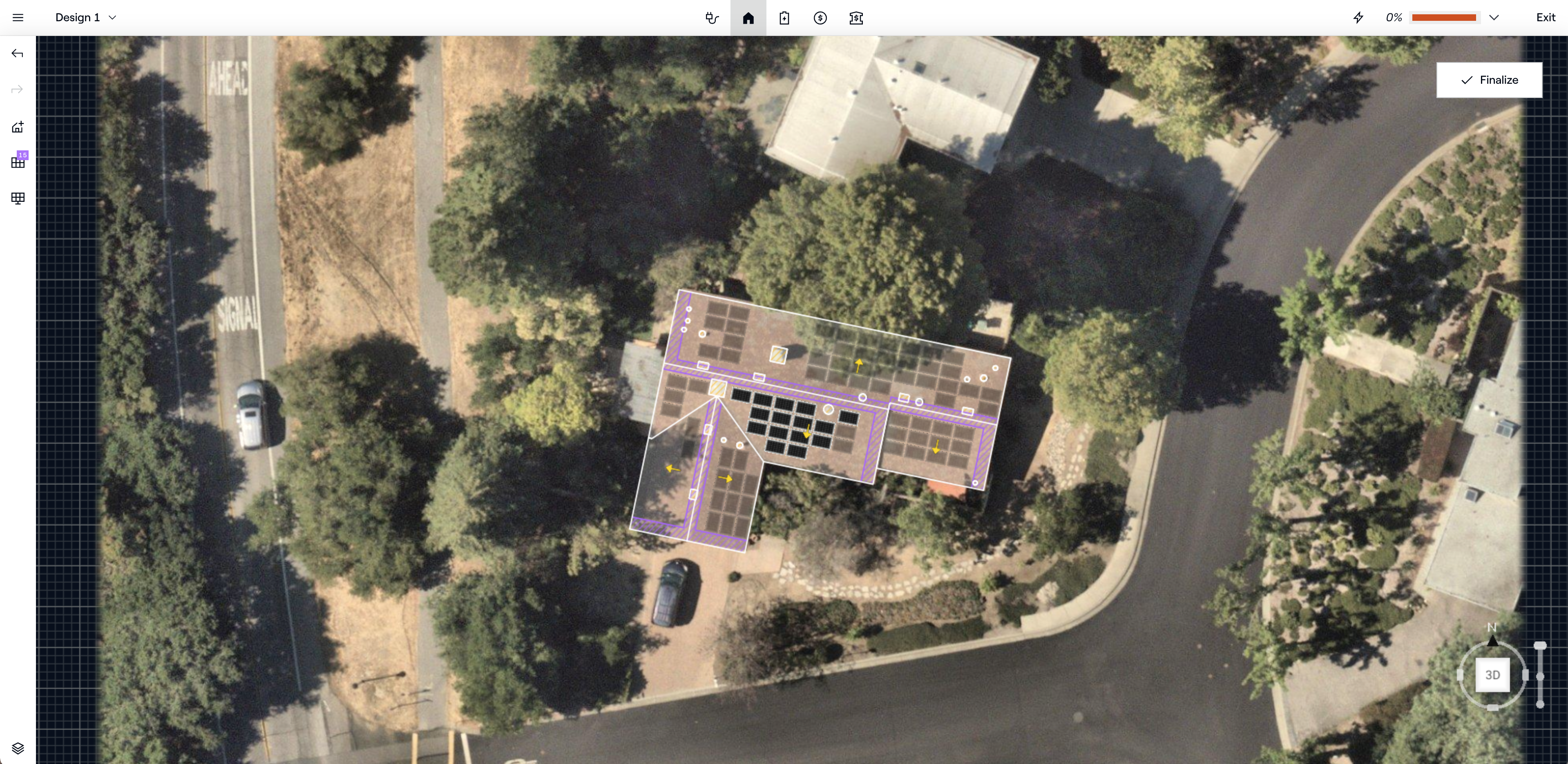Placement automatique des chemins de feu permet de placer automatiquement des chemins sur le dessin. Lorsqu'il n'y a pas de panneaux sur le toit, Aurora placera l'ensemble minimum de chemins requis par le code international des incendies de l'AHJ du projet (qui est automatiquement défini en fonction de l'emplacement). Lorsqu'il y a déjà des panneaux sur le toit, Aurora tiendra compte de l'espace disponible couvert par les panneaux lors de la mise en place de l'ensemble minimal de chemins. Le résultat évitera les panneaux dans la mesure du possible, mais placera des chemins au-dessus des panneaux si nécessaire (par exemple, si le panneau est très proche d'une crête). Les panneaux qui se chevauchent deviennent jaunes pour indiquer clairement qu'ils doivent être déplacés.