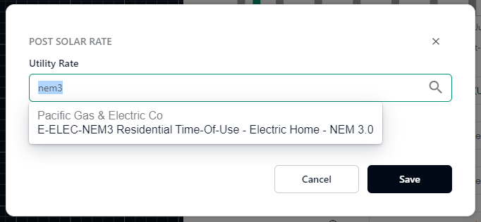 Dans Aurora, vous pouvez spécifier le tarif NEM 3.0 en définissant le tarif post-solaire dans la page de synthèse de la consommation d'énergie ou pour une conception spécifique. Si le tarif n'apparaît pas dans la liste déroulante, vous pouvez rechercher « NEM3 » pour le trouver. Notre fournisseur tiers de tarifs liste les tarifs comme E-ELEC-NEM3, TOU-DR-PRIME-NEM3, et EV-TOU-5-NEM3.