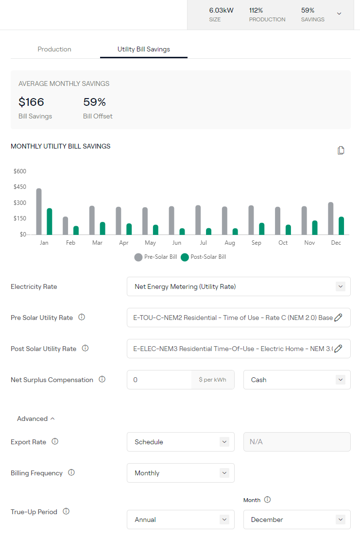 Pour montrer à un client potentiel la différence entre NEM 2.0 et le NBT, vous devez changer le Tarif Post-Solaire du tarif NEM 2.0 approprié vers notre tarif d'approximation NBT / NEM3. Le Tarif Post-Solaire peut être modifié dans la section « Détails d'utilisation » des pages Aperçu de la consommation et de la facture en mode Ventes, ou dans la section Économies sur la facture d'électricité en mode Conception.