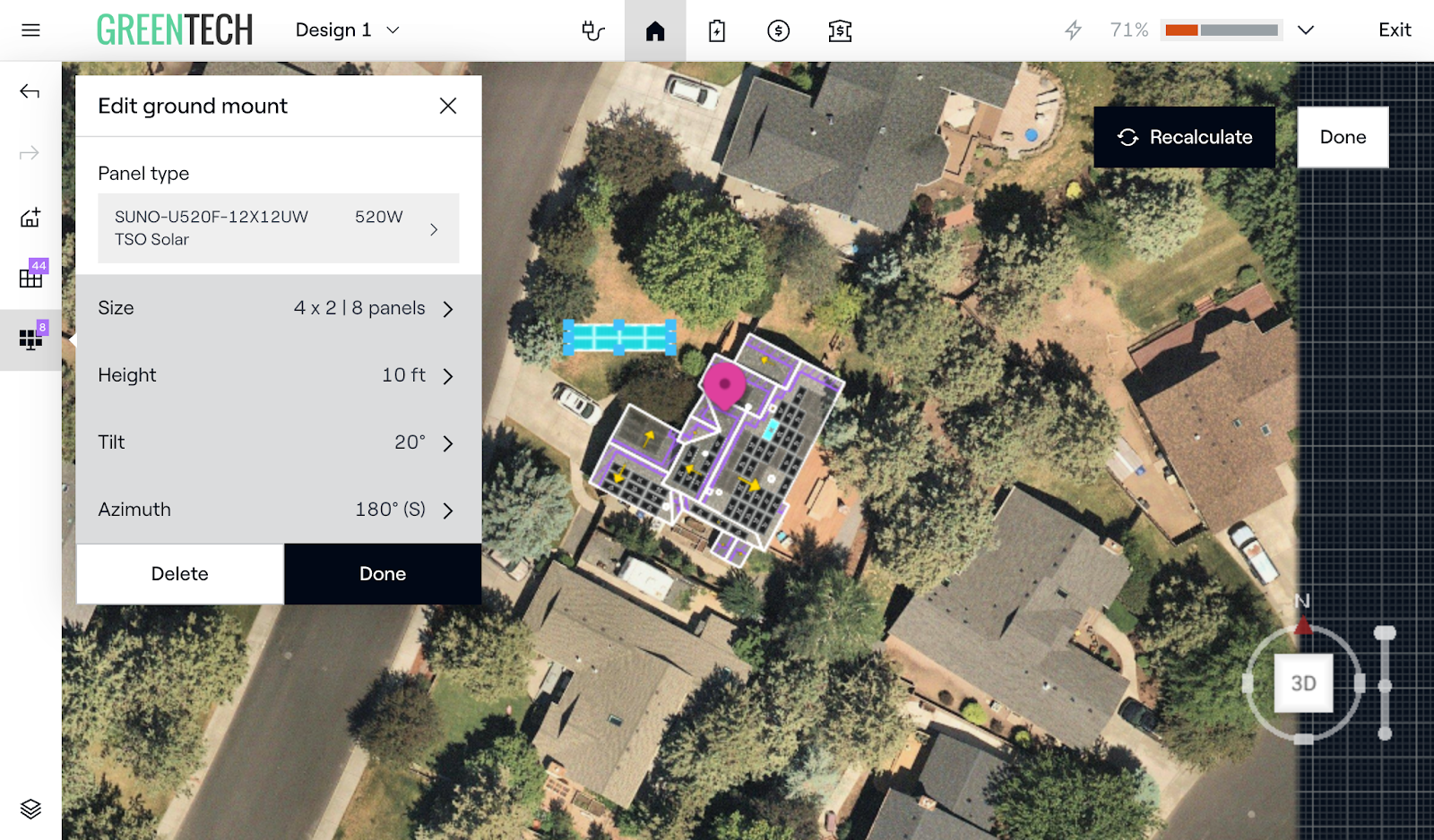 Un nouveau menu s'ouvre sur le côté gauche de l'écran. Ici, vous sélectionnerez le Type de Panneau, la Taille du Support au Sol, la Hauteur au-dessus du sol, l'Inclinaison et l'Azimut.