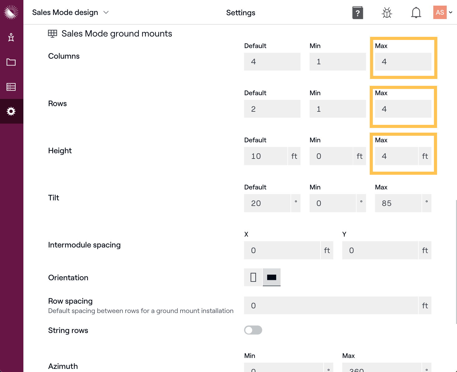 Remarque : Certains de ces réglages sont prédéfinis par l'administrateur du compte. Pour ajuster les paramètres par défaut, les administrateurs peuvent naviguer vers Paramètres > Conception en mode Vente. Faites défiler vers le bas jusqu'aux paramètres du support au sol et augmentez la Limite Maximale de Colonnes, la Limite Maximale de Hauteur et la Limite Maximale de Rangées.