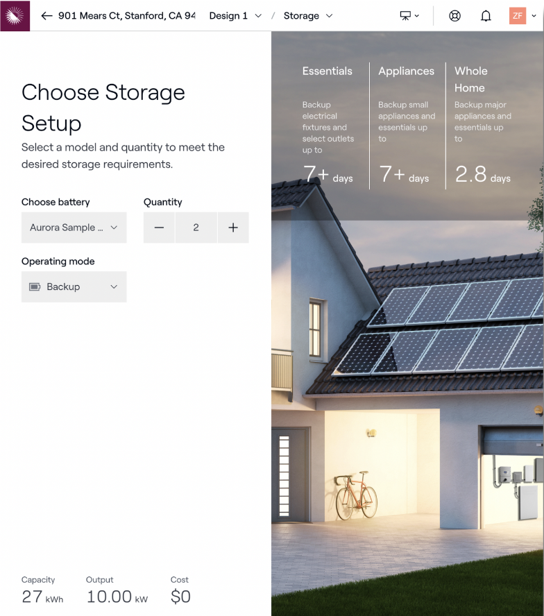 Le stockage de secours permet aux propriétaires d'utiliser la batterie de leur maison en cas de situation d'urgence, lorsqu'ils ne sont pas en mesure de se connecter au réseau énergétique. Aurora calculera la durée de sauvegarde (en jours) pour :