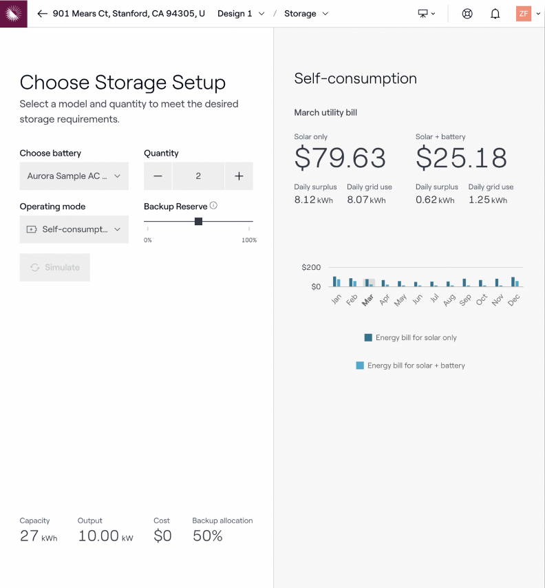 Si un propriétaire choisit d'utiliser sa batterie pour l'autoconsommation, cela suppose qu'il consommera régulièrement l'énergie de sa batterie et la rechargera avec l'énergie excédentaire de son système solaire. Aurora calculera les factures mensuelles estimées des propriétaires pour les services publics :