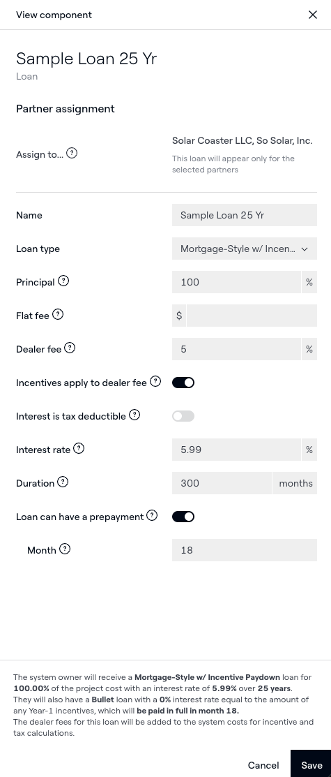 Le type de prêt Style hypothécaire avec remboursement incitatif modélise une structure de prêt combinée en une seule configuration : un prêt standard de type hypothécaire associé à un prêt Bullet à intérêt 0 % calculé automatiquement, égal aux incitations du projet (généralement le crédit d'impôt à l'investissement, ITC). C’est la manière native de modéliser les produits de prêt fractionnés proposés par des prêteurs comme Sunnova.