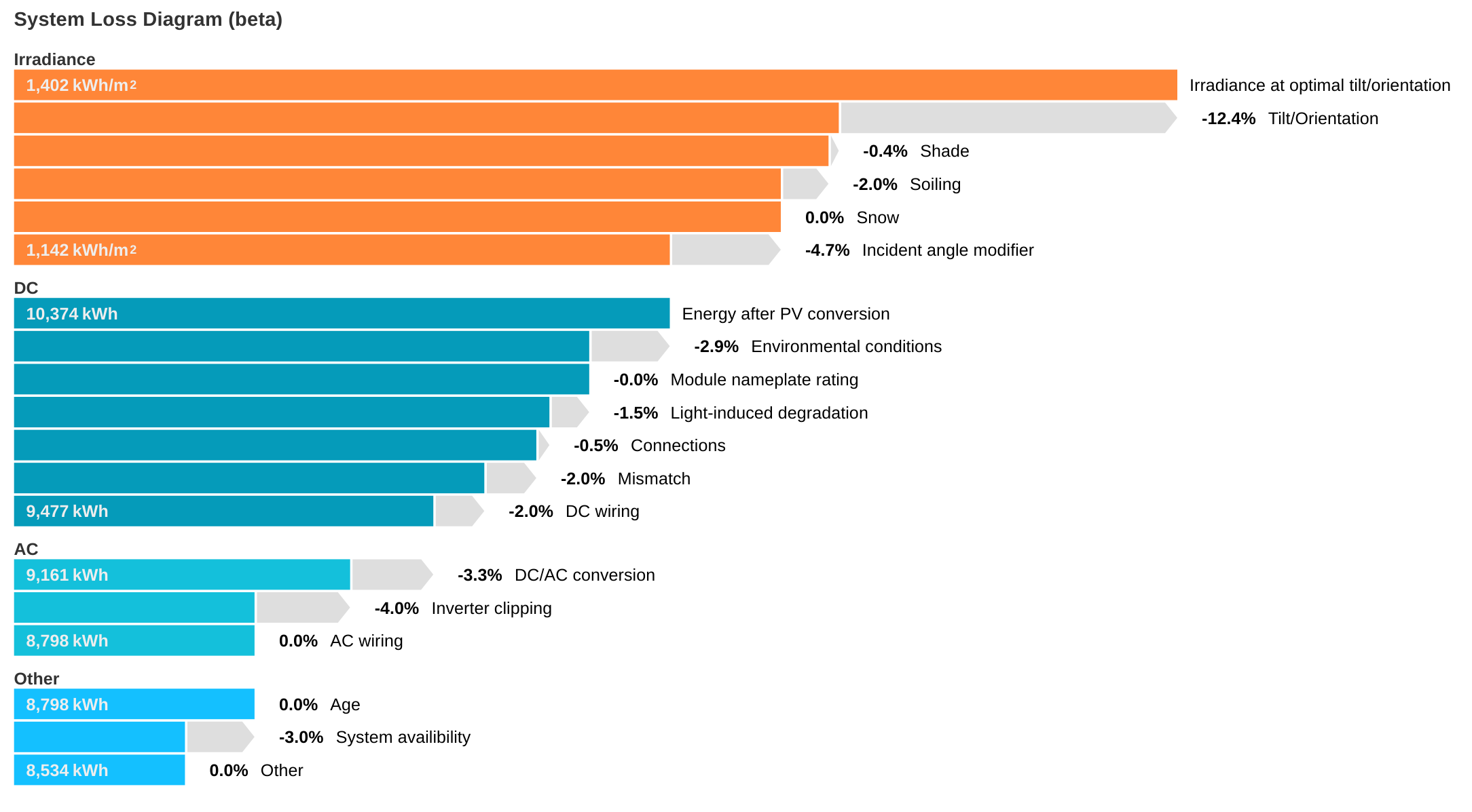 Cette catégorie indique les pertes d'irradiation sur les modules d'un modèle. Il couvre les pertes environnementales ainsi que les pertes dues à une inclinaison et une orientation sous-optimales.