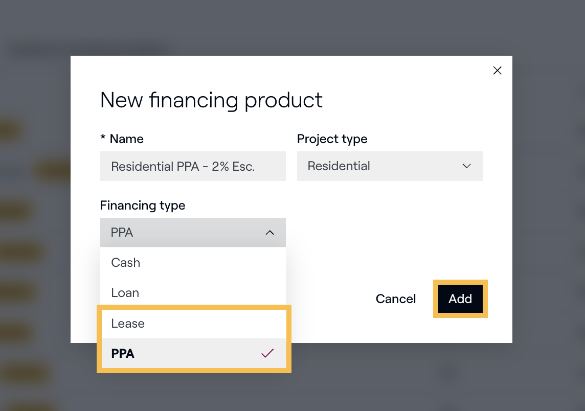 Cliquez ici Ajouter un produit de financement en haut à droite et utilisez la fenêtre contextuelle pour donner un nom au produit, sélectionnez un type de projet (résidentiel ou commercial), puis sélectionnez Bail ou CAE comme type de financement. Cliquez sur Ajouter.