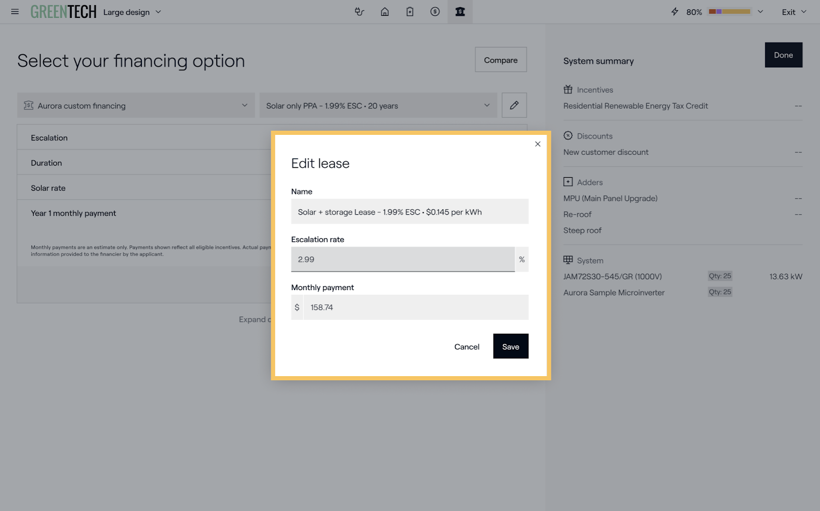 De retour en mode vente, le contrat de location ou le contrat d'achat d'énergie que vous avez sélectionné s'affiche avec le tarif solaire correspondant. tarif solaire, l'indexationet le Paiement mensuel de l'année 1. Pour choisir un autre taux ou un autre produit de financement, cliquez sur le bouton Modifier (crayon) (crayon).
