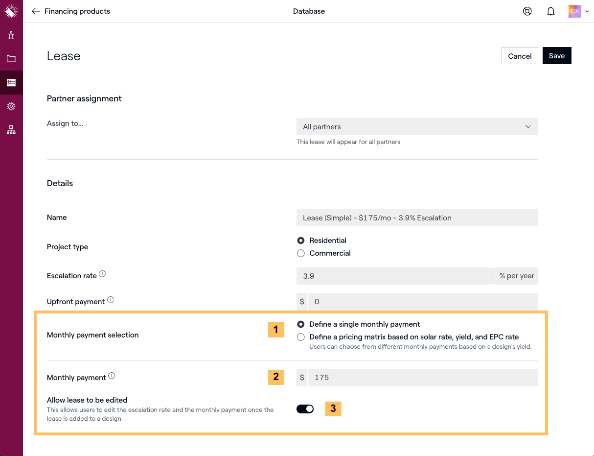 Les administrateurs de compte peuvent créer des contrats de location et d'achat d'électricité personnalisés que leurs représentants peuvent présenter en mode vente en téléchargeant les rendements, les tarifs (kWh), le prix EPC par watt (PPW) et les taux d'indexation liés aux produits de financement qu'ils proposent.