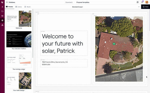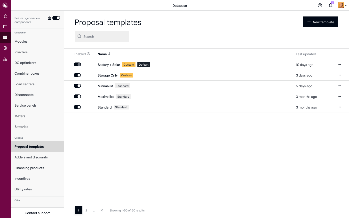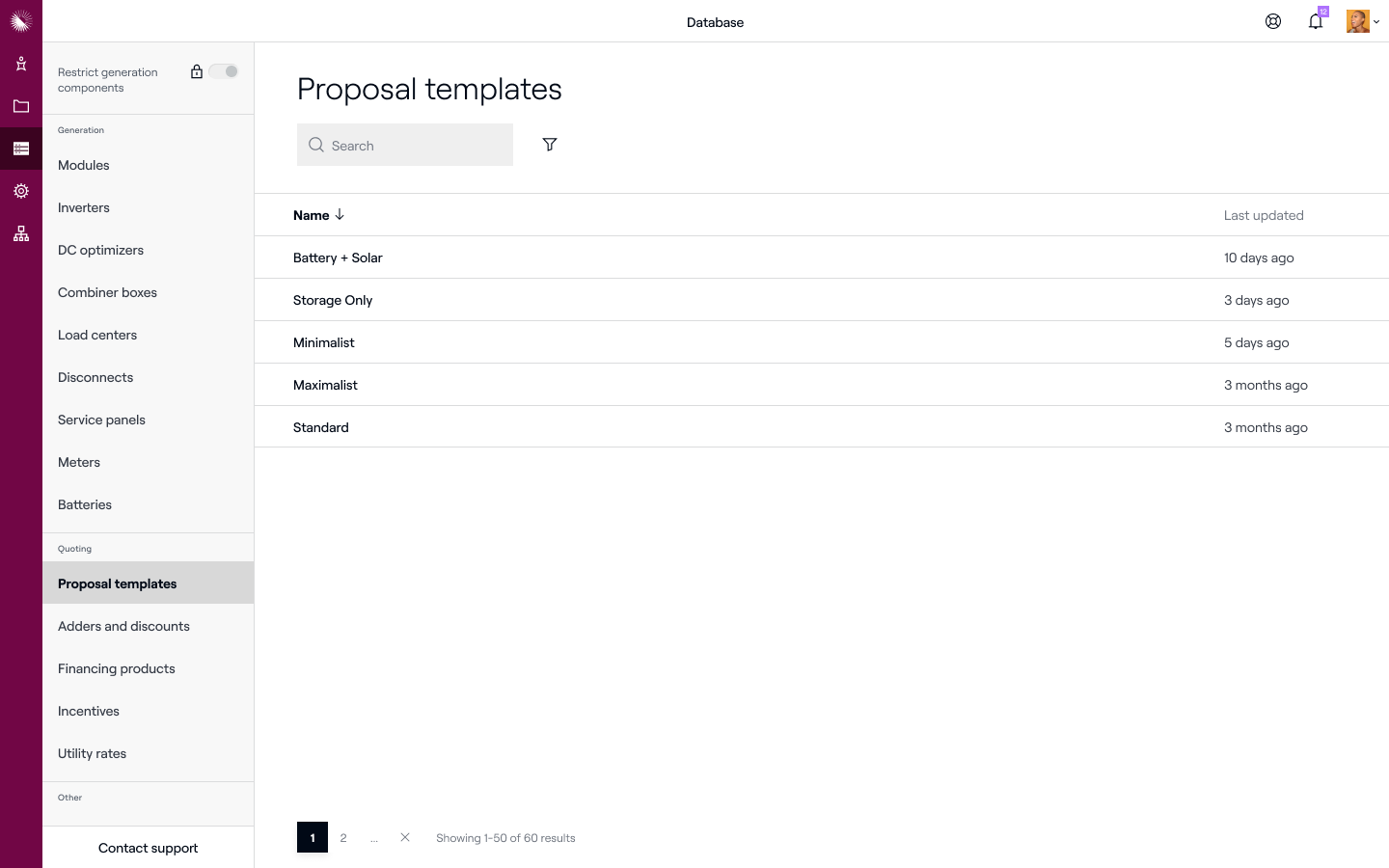 Au lieu de naviguer vers Paramètres > Personnalisation du mode de vente, les administrateurs navigueront vers Base de données > Modèles de proposition pour afficher, gérer et créer des modèles de mode de vente.
