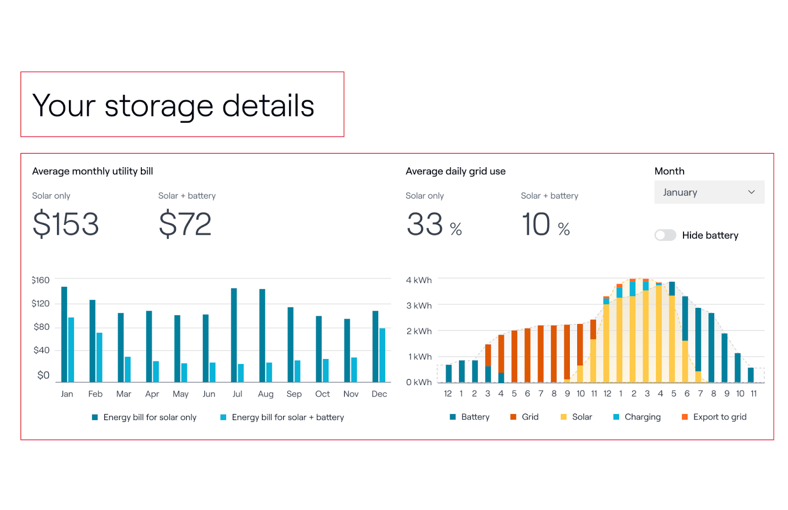 Auparavant, les représentants pouvaient cliquer sur un bouton "Détails de l'utilisation" à partir de la page standard "Aperçu de la facture" pour afficher un graphique mensuel de leur consommation d'énergie par rapport à leur production. Nous avons maintenant supprimé cette page du modèle Starter.