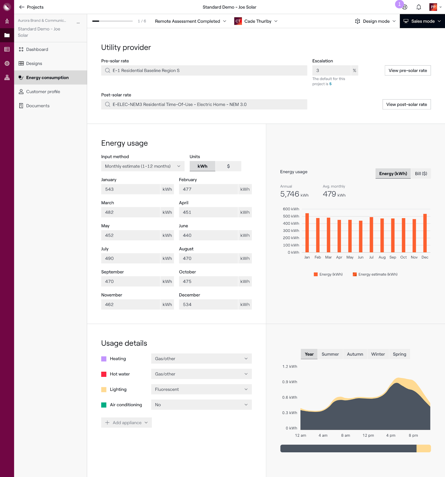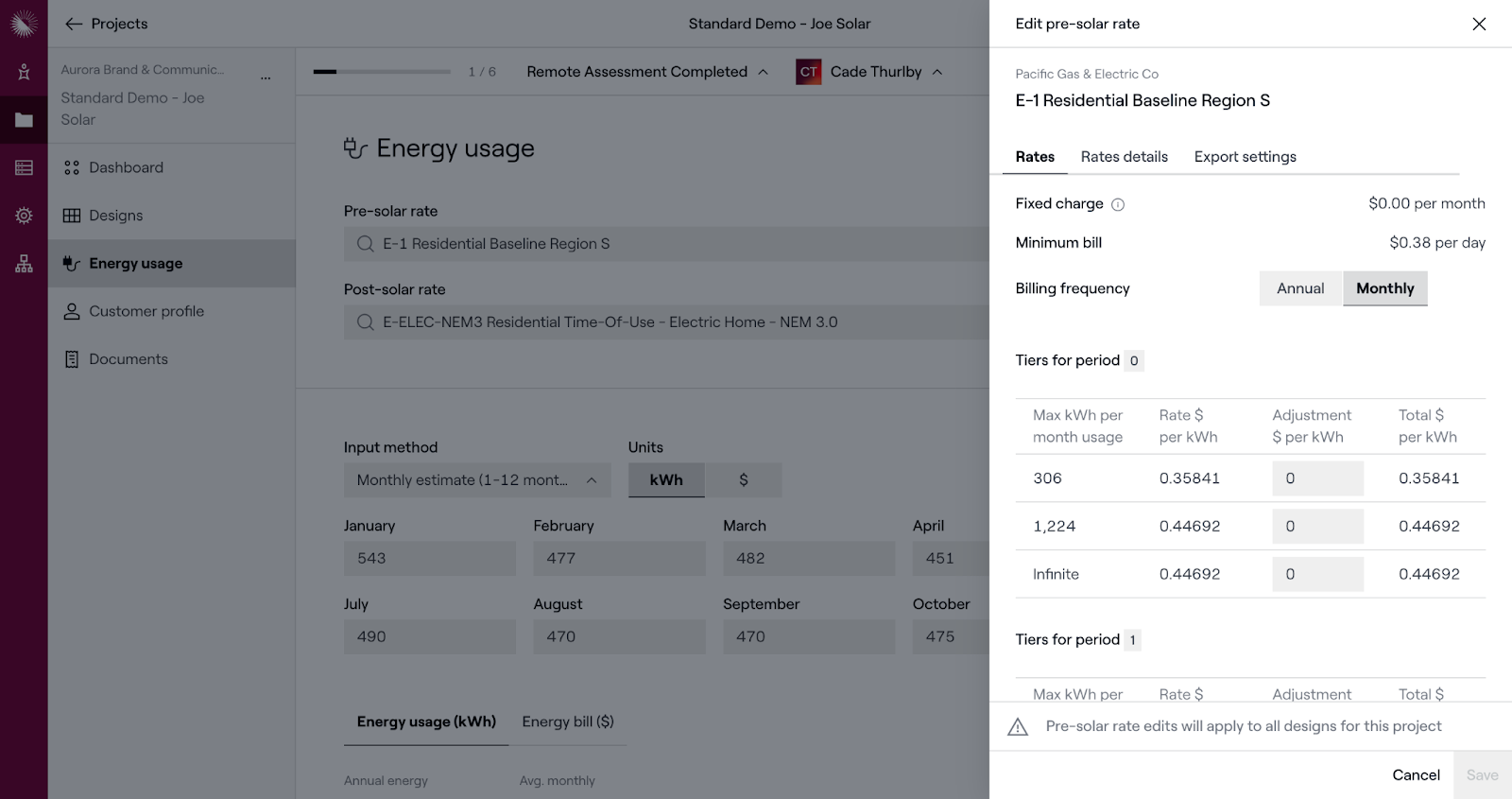 Pour les projets individuels d'Aurora, les utilisateurs pourront voir et modifier les détails des tarifs pré- et post-solaires sur la page Utilisation de l'énergie en mode vente et sur le tableau de bord du projet.