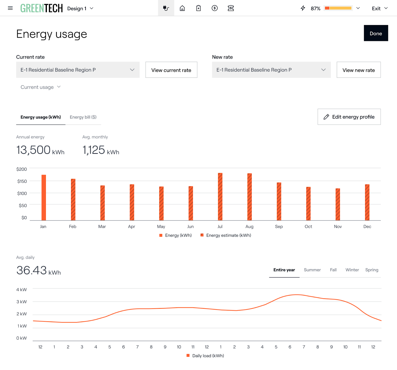 En mode conception, les utilisateurs trouveront une barre latérale de simulation mise à jour, qui comprend un bouton "Modifier le profil énergétique". À partir de là, ils peuvent ajouter les optimisations énergétiques que l'administrateur a configurées dans la base de données. Ces sélections mettront à jour les besoins futurs du propriétaire en matière de consommation d'énergie et auront un impact sur la compensation cible pour la proposition de système photovoltaïque.