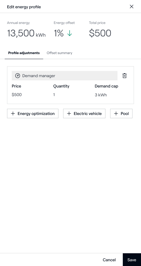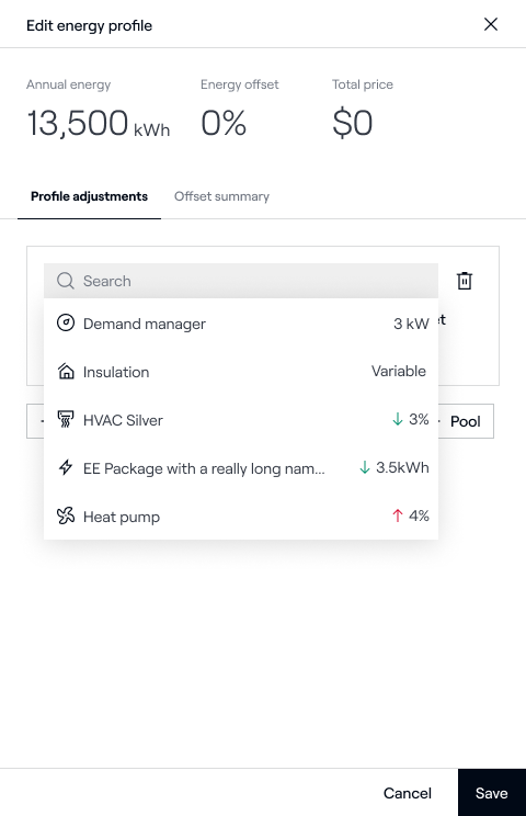 En mode vente, les utilisateurs trouveront un nouveau bouton "Modifier le profil énergétique" sur la page Utilisation de l'énergie. À partir de là, ils peuvent ajouter les optimisations énergétiques que l'administrateur a configurées dans la base de données. Ces sélections mettront à jour les besoins futurs du propriétaire en matière de consommation d'énergie et auront un impact sur la compensation cible pour la proposition de système photovoltaïque.