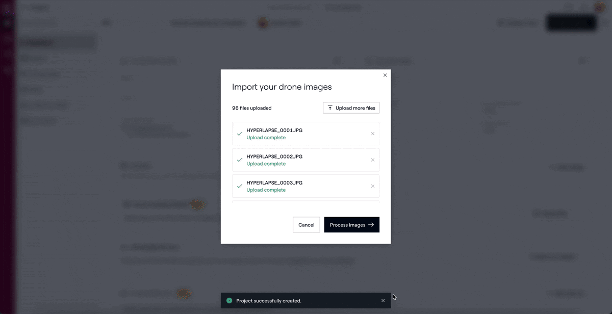 Remarque : Le traitement des images de drone s’effectue de façon asynchrone. Vous pouvez quitter le projet pendant le traitement et revenir plus tard.